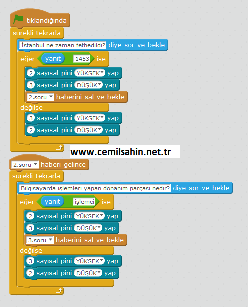 Bu uygulama sayesinde öğrencilere Mblock’taki karakterimiz soru soracak ve verilen cevaba göre doğruysa yeşil, yanlışsa kırmızı ledimiz yanacaktır.